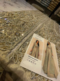 Dipped in golds and silvers this regal attire is a breath of fresh air for this wedding season. Blooming florals, meticulous hand-crafted modern patterns envisioned on a gold tissue base. Hand embroidered with lush gold and silver threads finished with elegant hand embellished crystals, delicately cut mirror pieces, sequins and gold zari.