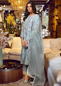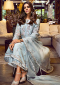 The long statement raw silk shirt and culottes of the dreamy blue ensemble are generously embellished with floral motives and illustrious patterns paired with a luminous organza duppata. The finely curated fabric finishing's elevate the glamour quotient of the outfit making it a quintessential for a festive wardrobe this season.