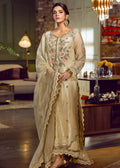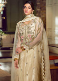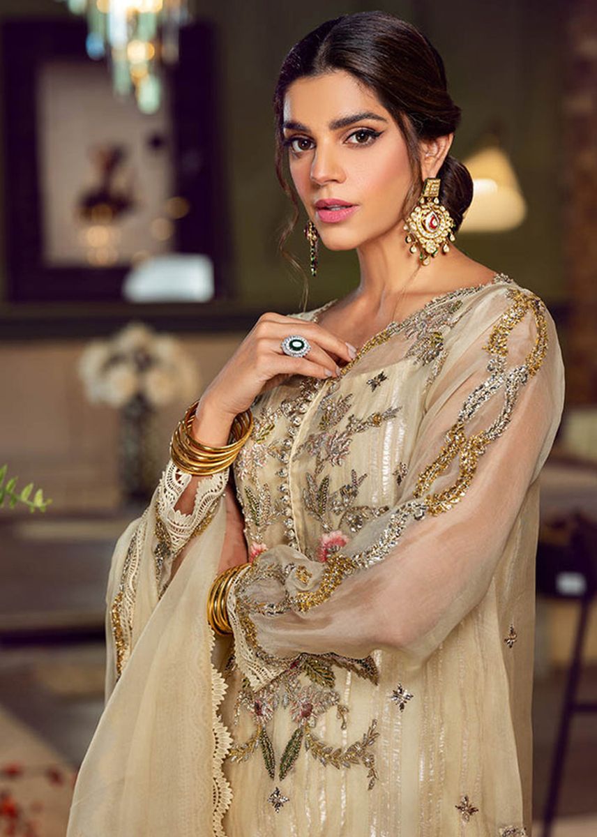A blissful shade of ivory yellow delicately adorned with Mukesh borders, dabka and threadwork. It is combined with an airy organza dupatta and sombre silk plazzoes finished with lace. The sophisticated ensemble is a must have this summer for all the festivities ringing at your fashion doorstep thus wedding season.