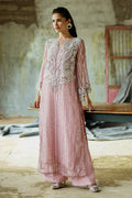 A stunning blend of elegance and sophistication, featuring an embroidered net shirt paired with luxurious raw silk trousers. The look is completed with an ethereal organza dupatta for timeless elegance.
