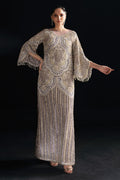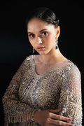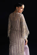 Crafted from a delicate net canvas in a soft lilac hue, Nuru is adorned with a symphony of luxurious details. Meticulously placed pearls, sparkling crystals, and intricate dabka embroidery grace the fabric, creating a captivating dance of textures and luminosity.