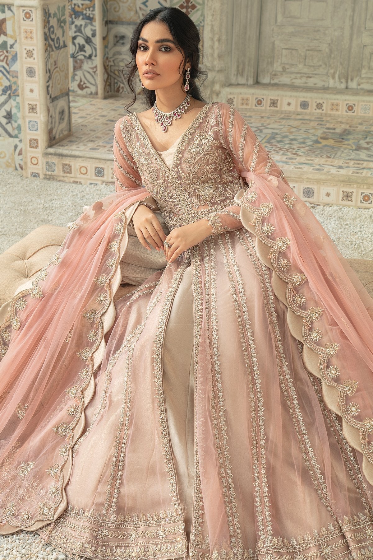 Description: Toe Kiss length blush pink Net gown embellished with dramatic merge of rose Gold and silver naqshi dabka floral pattern has no shortage of intricate hand work details. Oxidized rose Gold tone tissue lehnga crafted by highly skilled technique along four-sided hand embellished scalped running boarder on net dupatta complete the silhouette.
