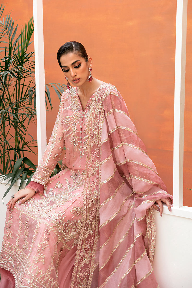 Crafted in premium pink hue , this outfit boasts a soft and alluring hue that is both eye-catching and gentle on the eyes. The enchanting ensemble Simona features meticulous handwork embellishments, showcasing a delicate interplay of kora, dabka, naqshi, sequins, pearls, and Swarovski crystals. This finely tailored garment exudes sophistication and grace, promising to captivate hearts at any event or special occasion.